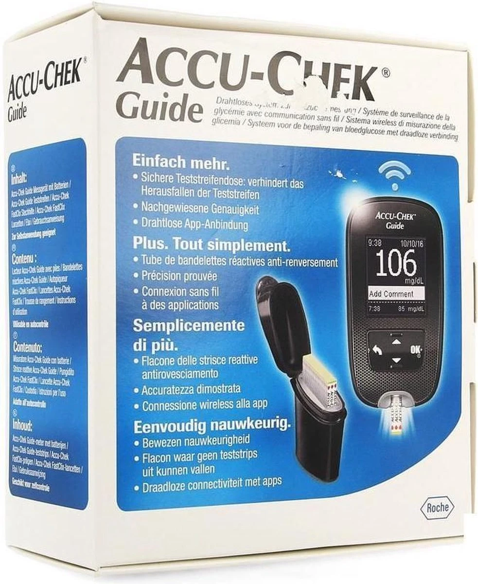 De Accu-Chek® Guide Glucosemeter biedt verrassend slimme oplossingen die het meten van bloedglucose eenvoudiger maken. De SmartPack verpakking is ontworpen om verspilling van teststrips tegen te gaan en maakt het eenvoudiger om slechts één teststrip tegelijk te nemen. Bovendien zorgen een verlichte teststrippoort, teststrip met brede applicatiezone en strip ejector knop voor minder gedoe in het alledaagse meten.