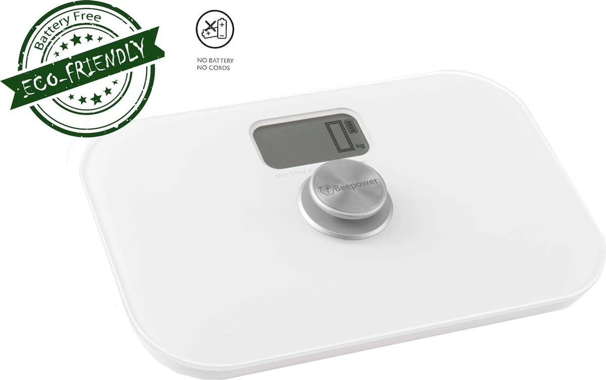 Voor deze weegschaal zijn geen batterijen benodigd wat wel zo duurzaam is. Simpelweg één keer op de knop drukken en er is genoeg energie om te wegen (ongeveer 3 minuten stroom voor één á twee keer drukken). Energieopwekking gebeurt aan de hand van kinetische energie.