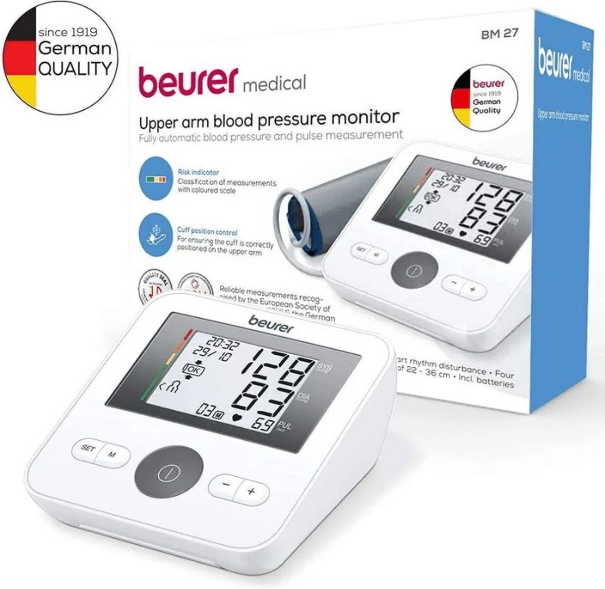 De Beurer BM27 is een volautomatische bovenarm bloeddrukmeter met een eenvoudig te lezen display. De BM27 heeft voor 4 gebruikers geheugenplaatsen waarbij de gemiddelde waarden worden bijgehouden. De bediening is erg eenvoudig waardoor de bloeddrukmeter voor iedereen geschikt is. De bijgeleverde manchet is geschikt voor een bovenarmomtrek van 22 tot 42 cm.