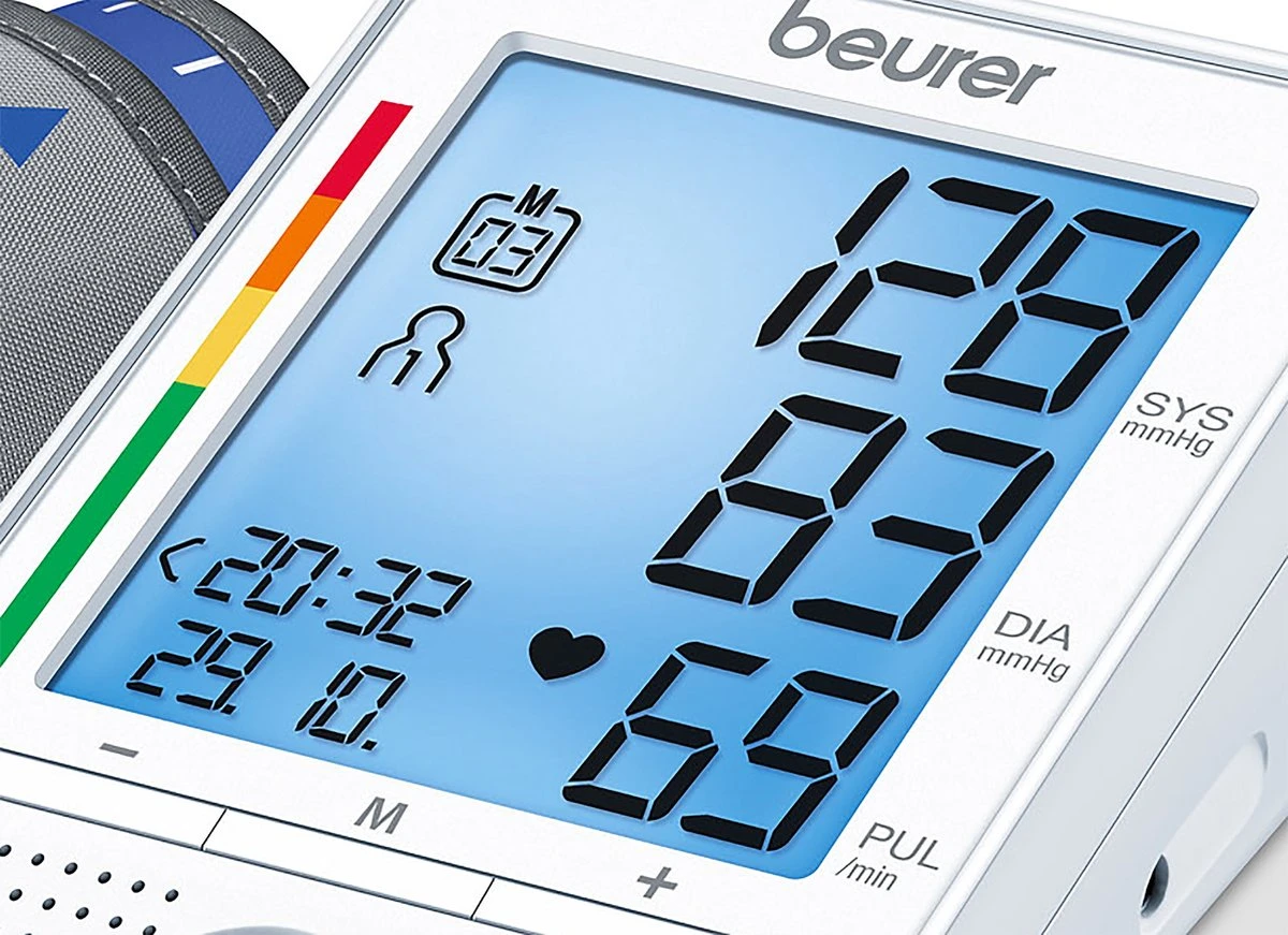 Ook worden de waarden weergegeven op het grote display. Met de BM49 kan je snel en eenvoudig de bloeddruk en hartslag meten, de meetwaarden opslaan en het verloop en het gemiddelde van de meetwaarde laten weergeven.