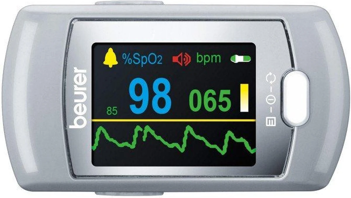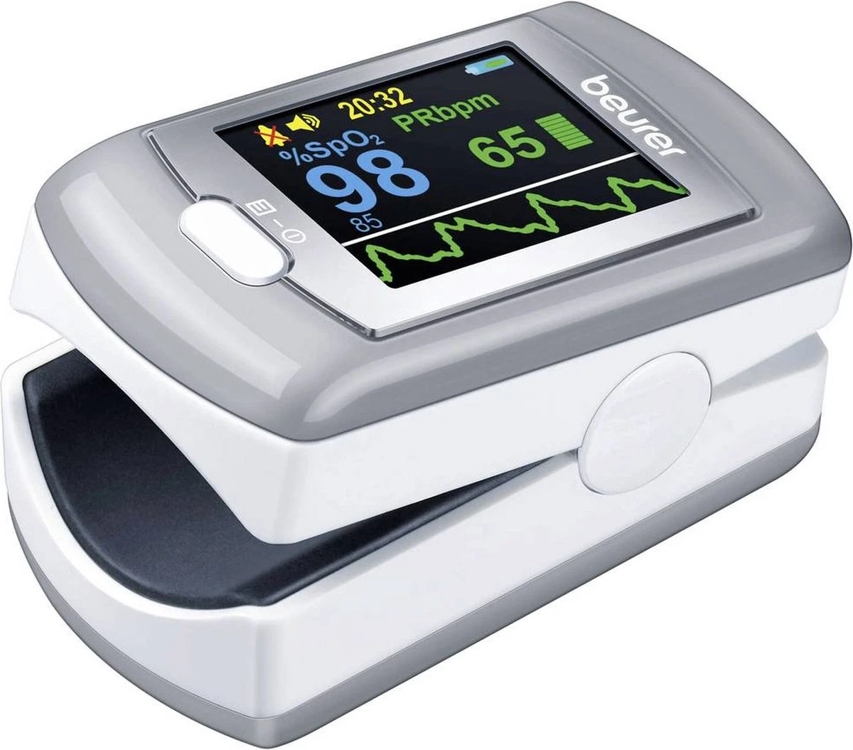 De pulse-oximeter PO80 van Beurer is bedoeld voor het niet-invasief meten van de arteriële zuurstofverzadiging (SpO2) en de hartslagfrequentie (polsslagfrequentie). De zuurstofverzadiging geeft aan hoeveel procent van de hemoglobine in het arteriële bloed verzadigd is met zuurstof. Daarom is het een belangrijke parameter voor het beoordelen van de ademhalingsfunctie. Als uw persoonlijk ingestelde alarmgrenzen worden onder- of overschreden, wordt u gewaarschuwd door middel van een geluidssignaal.