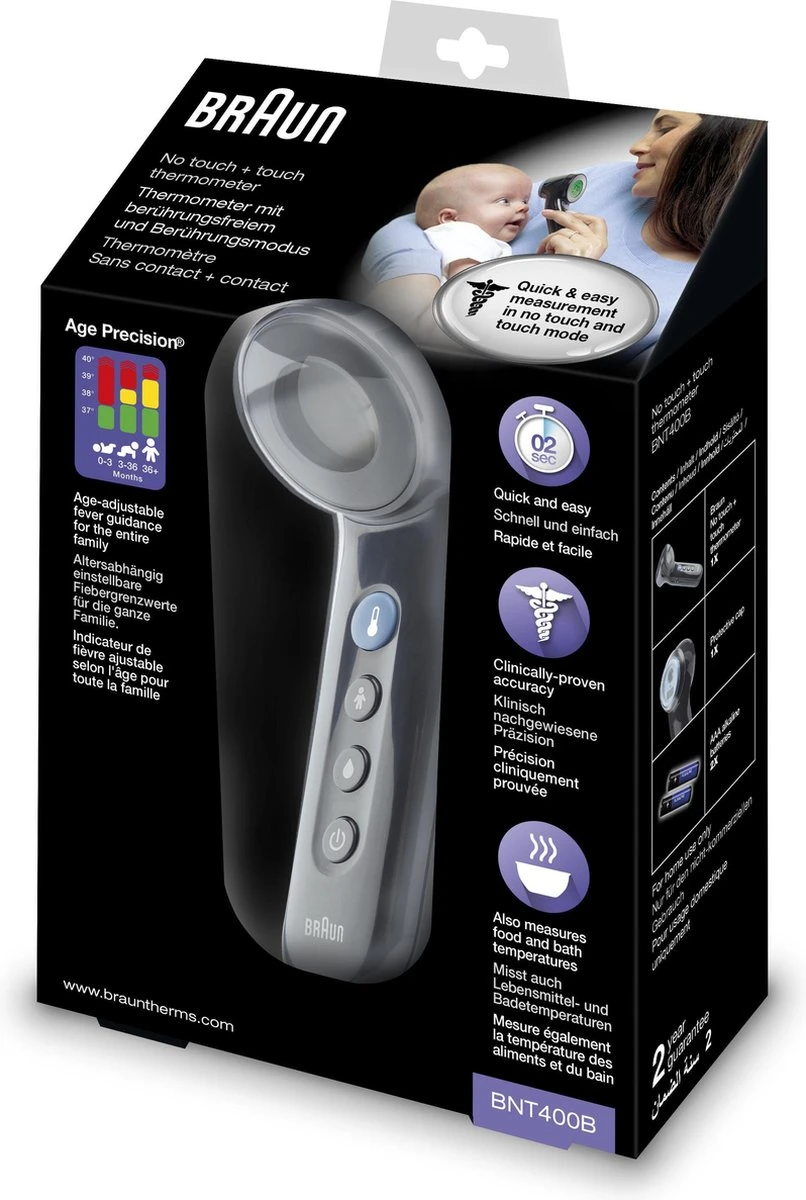 Met deze no touch digitale thermometer van Braun meet je de temperatuur van je baby vanaf een afstand door deze voor het voorhoofd te houden. Deze no touch thermometer is tevens voorzien van age precision waarbij er kleurcodes worden getoond per leeftijdscategorie vanaf 0-3 maanden tot boven de 3 jaar, de display toont dan groen bij een juiste tempertauur en rood bij verhoging wat voor kinderen van 0-3 maanden anders is dan peuters en kleuters. Uiteraard toont de thermometer ook de graden en is deze ook handig om te gebruiken om de temperatuur van het badwater te meten of het avondeten dan weet je zeker dat het de juiste tempepartuur heeft wat zeker in het begin best lastig kan zijn. Kortom een veilige, hygiënisch en praktische thermometer voor de hele familie. Braun is het merk dat het meest gebruikt wordt door artsen.