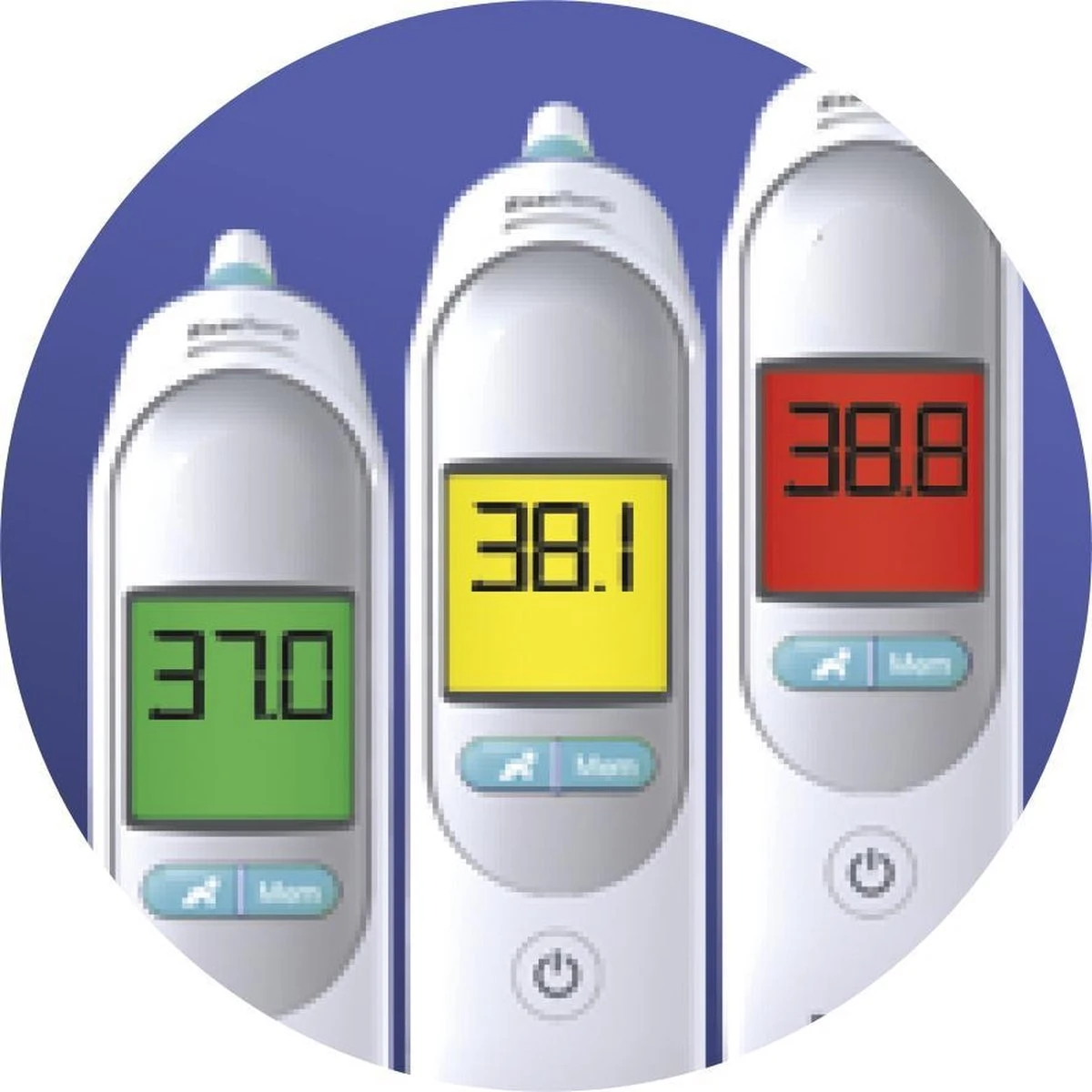 Een bijzondere eigenschap van deze oorthermometer is de koortsindicator. Na de meting verandert het display in een van de kleuren groen, geel of rood. Hiermee kunt u in een oogopslag zien of er sprake is van geen koorts, verhoging/koorts of hoge koorts.