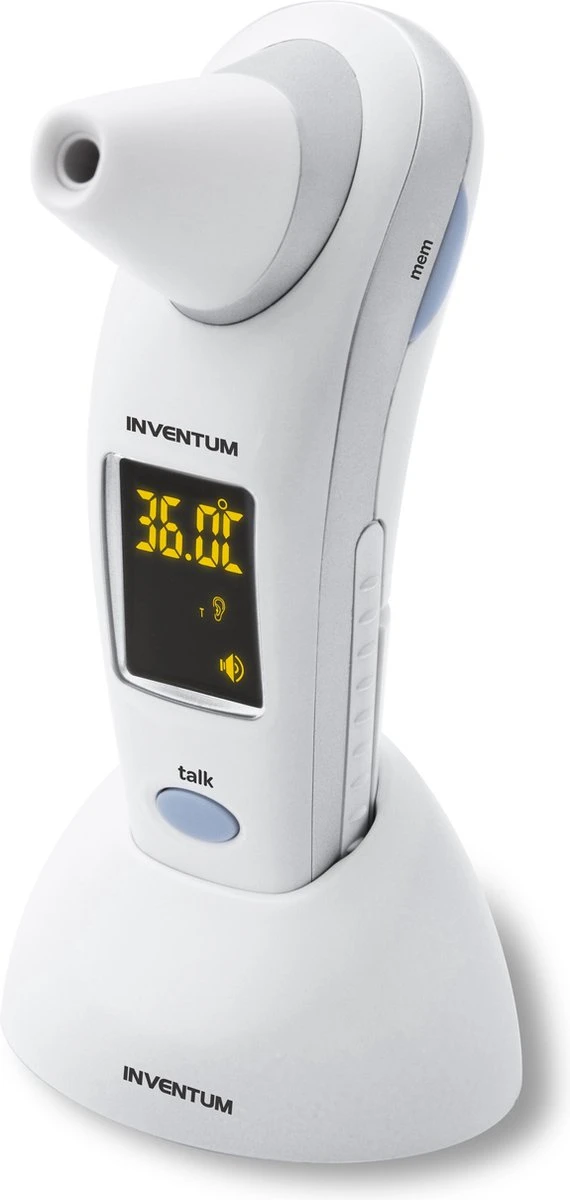 Met de Inventum thermometer TMO430 kun je naast je lichaamstemperatuur ook de omgevingstemperatuur meten. De lichaamstemperatuur kan via oor en voorhoofd gemeten worden. Binnen 2 seconden wordt de temperatuur getoond. De thermometer is voorzien van een Nederlandstalige spraakfunctie, een handige koortsindicatie en 30 geheugenplaatsen.