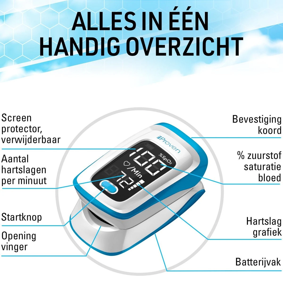 Meet je hartslag en zuurstofsaturatie binnen 10 seconden met iProven’s OXI-27 oximeter. Doe je vinger in de saturatiemeter en klik op de knop voor een live resultaat.