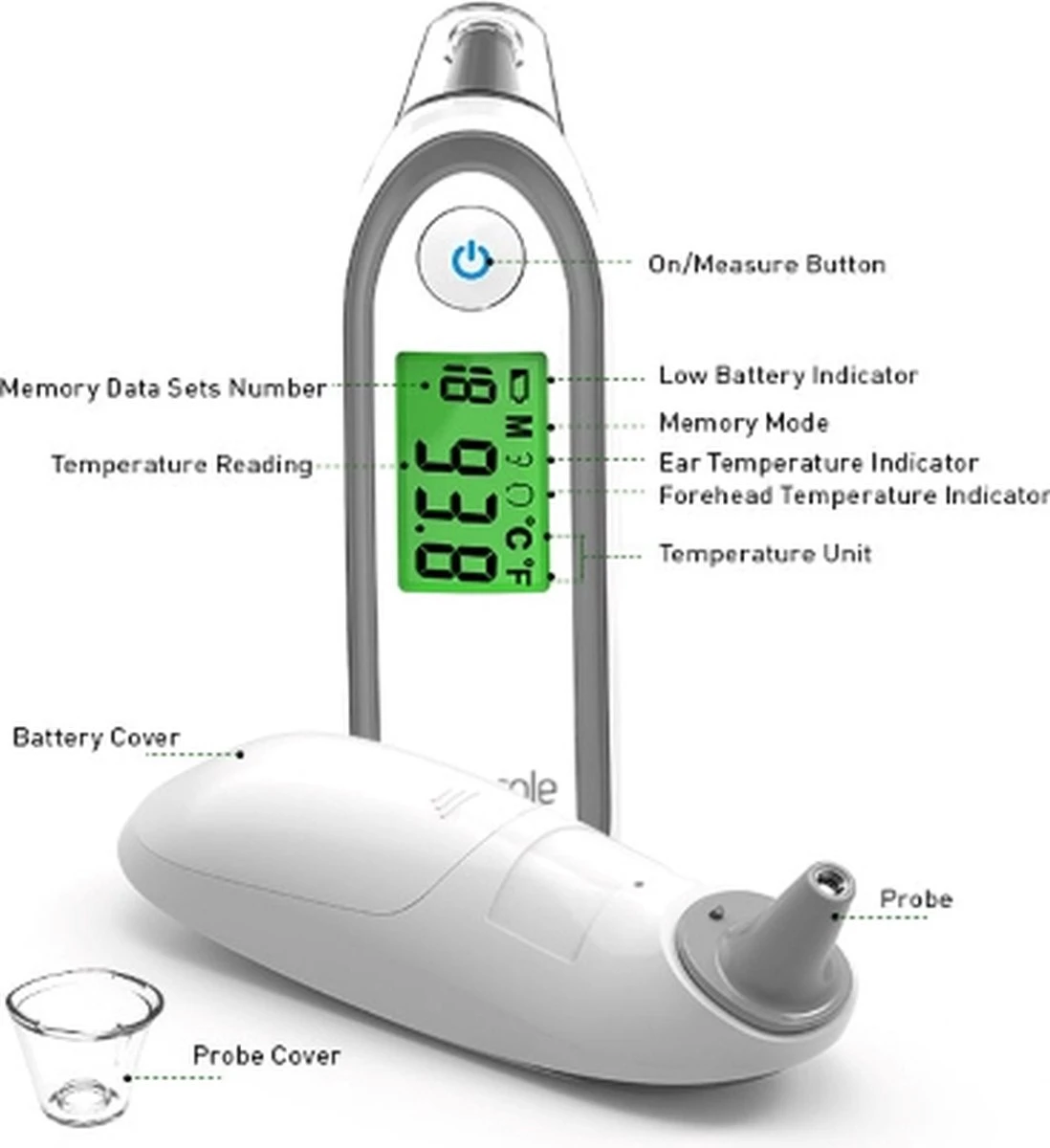 De oorthermometer is een ideaal hulpmiddel voor het meten van de temperatuur van kinderen en volwassenen. Gemakijk om koorts te meten. Met behulp van kleuren wordt er aangegeven of je koort heb of niet.
