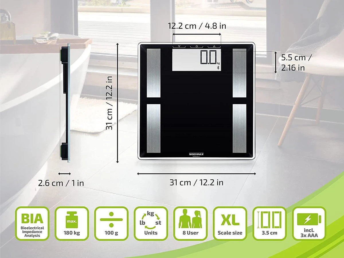 - Koppeling met de Soehnle Connect-App voor de smartphone, met eenvoudige bediening en je gegevens altijd bij de hand (systeemeisen voor gebruik van de app: Android™: 6.0 / iOS®: iOS 10 / Bluetooth®: 4.0)