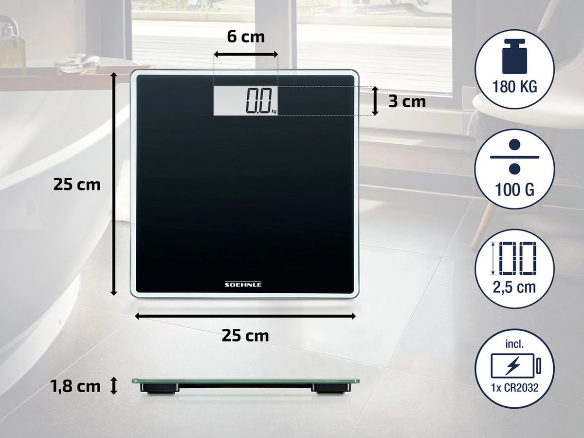 Dankzij het compacte, extra vlakke design overal plaats besparend op te bergen en daardoor ideaal voor kleinere badkamers – maar deze elegante weegschaal kan ook gerust vol in het zicht geplaatst worden. Ook qua comfort pakt dit kleintje groot uit: tot maximaal 180 kg wordt het lichaamsgewicht op het goed afleesbare lcd-display exact aangegeven, tot op 100 gram nauwkeurig. De weegschaal gaat meteen aan als je erop stapt en schakelt zich na het wegen automatisch weer uit. Dat is energiezuinig en bespaart kosten – en de meegeleverde batterijen gaan lang mee. Een kwaliteitsweegschaal – dat zie je ook aan het hoogwaardige veiligheidsglas en het kinderveilige, vast te schroeven batterij vak.