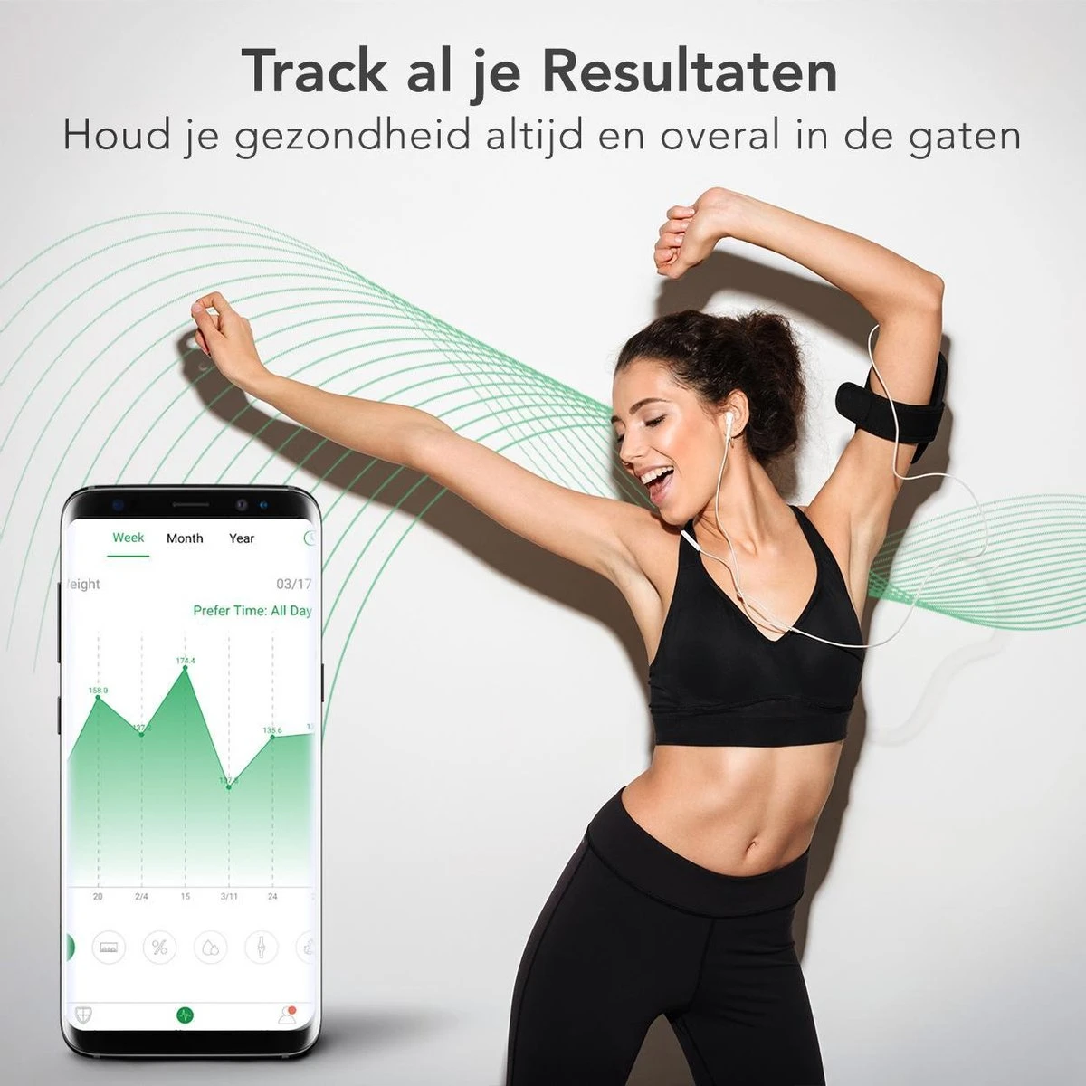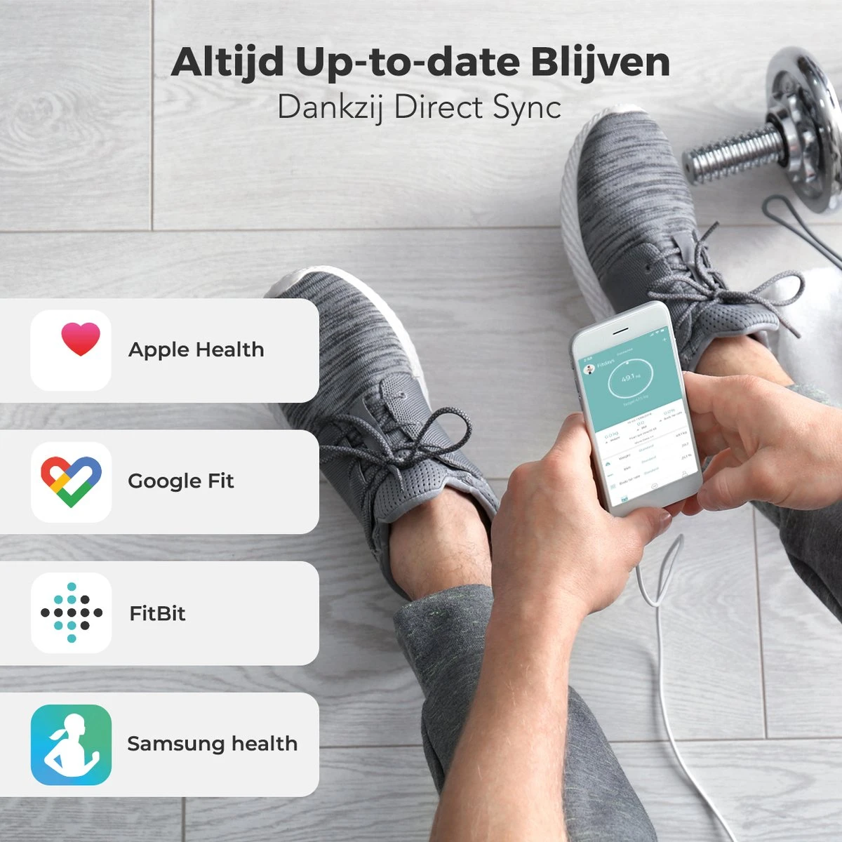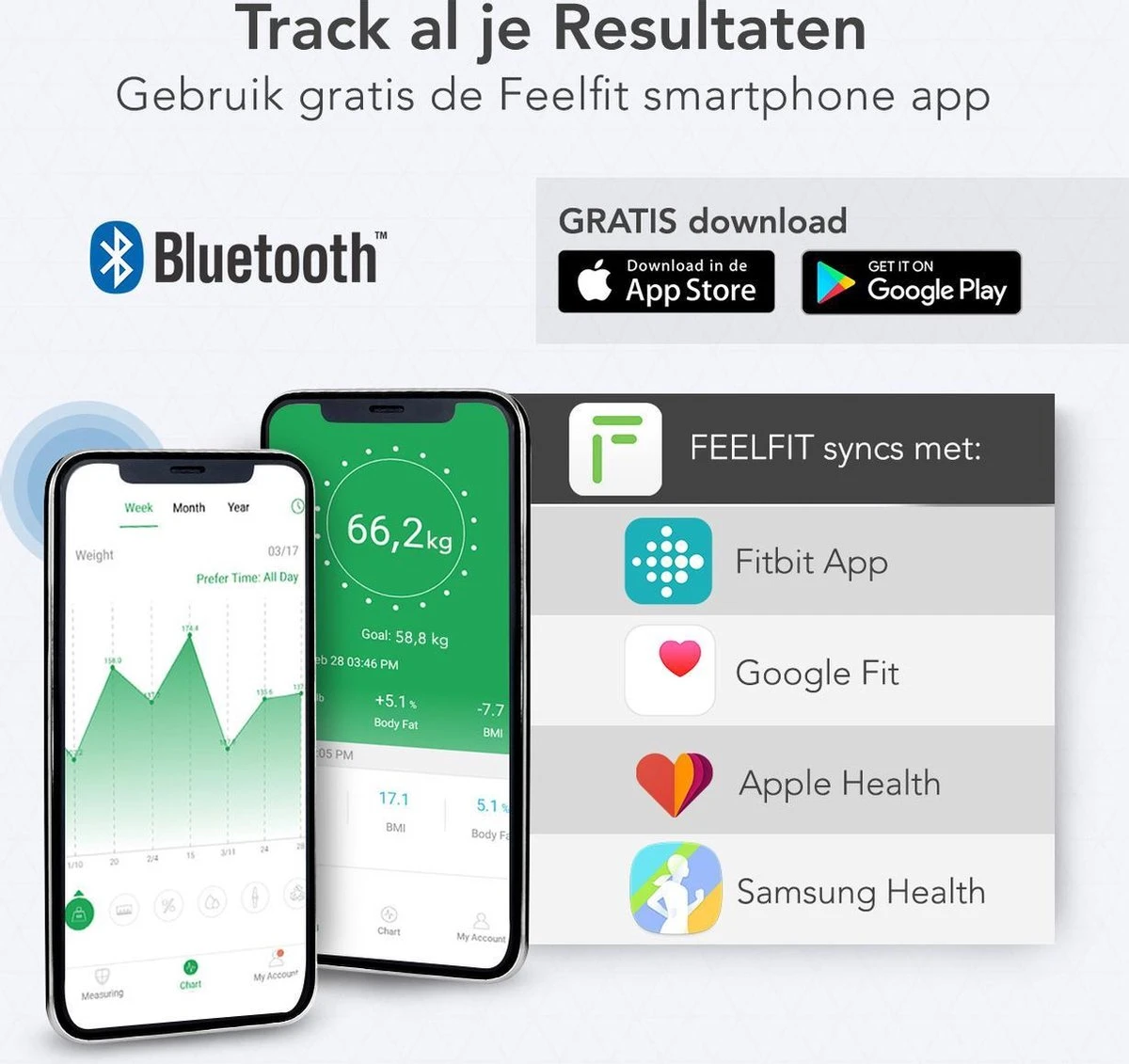Ieder van de 11 metingen wordt bijgehouden in de bijbehorende FeelFit app. Zodra je smartphone verbonden is met bluetooth slaat hij de metingen automatisch op in de app. Zo houd je je proces gemakkelijk bij en werk je nog sneller naar je einddoel toe! FeelFit kun je tevens synchroniseren met Samsung Health, FitBit, Apple Health en Google Fit.