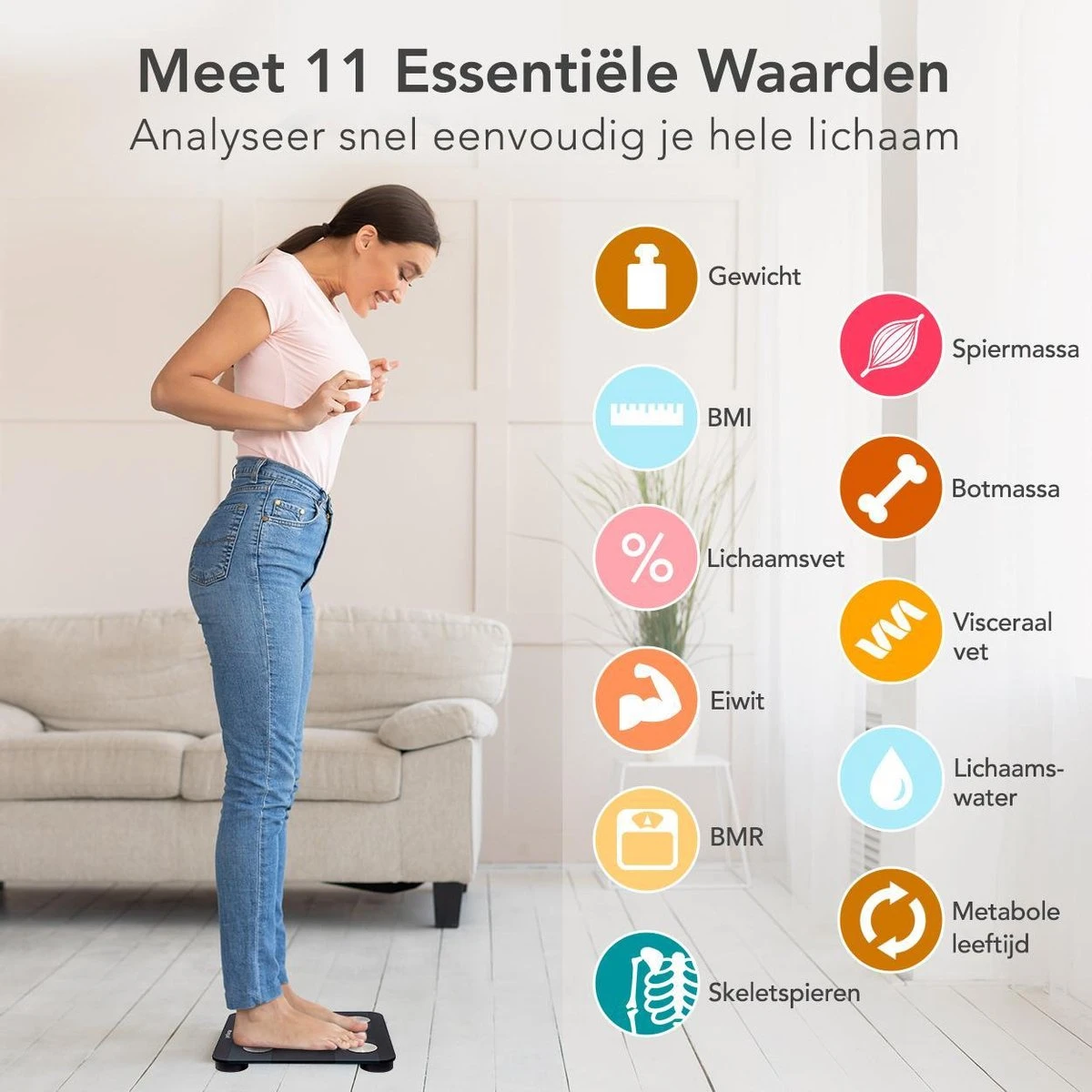Krijg meer inzicht in de samenstelling van jouw lichaam met behulp van een gedetailleerde lichaamsanalyse. Meet niet enkel je gewicht, maar ook je vetpercentage, lichaamswater, spiermassa, metabolische leeftijd, skeletspiermassa, botmassa, eiwit, visceraal vetpercentage, bmr en bmi.
