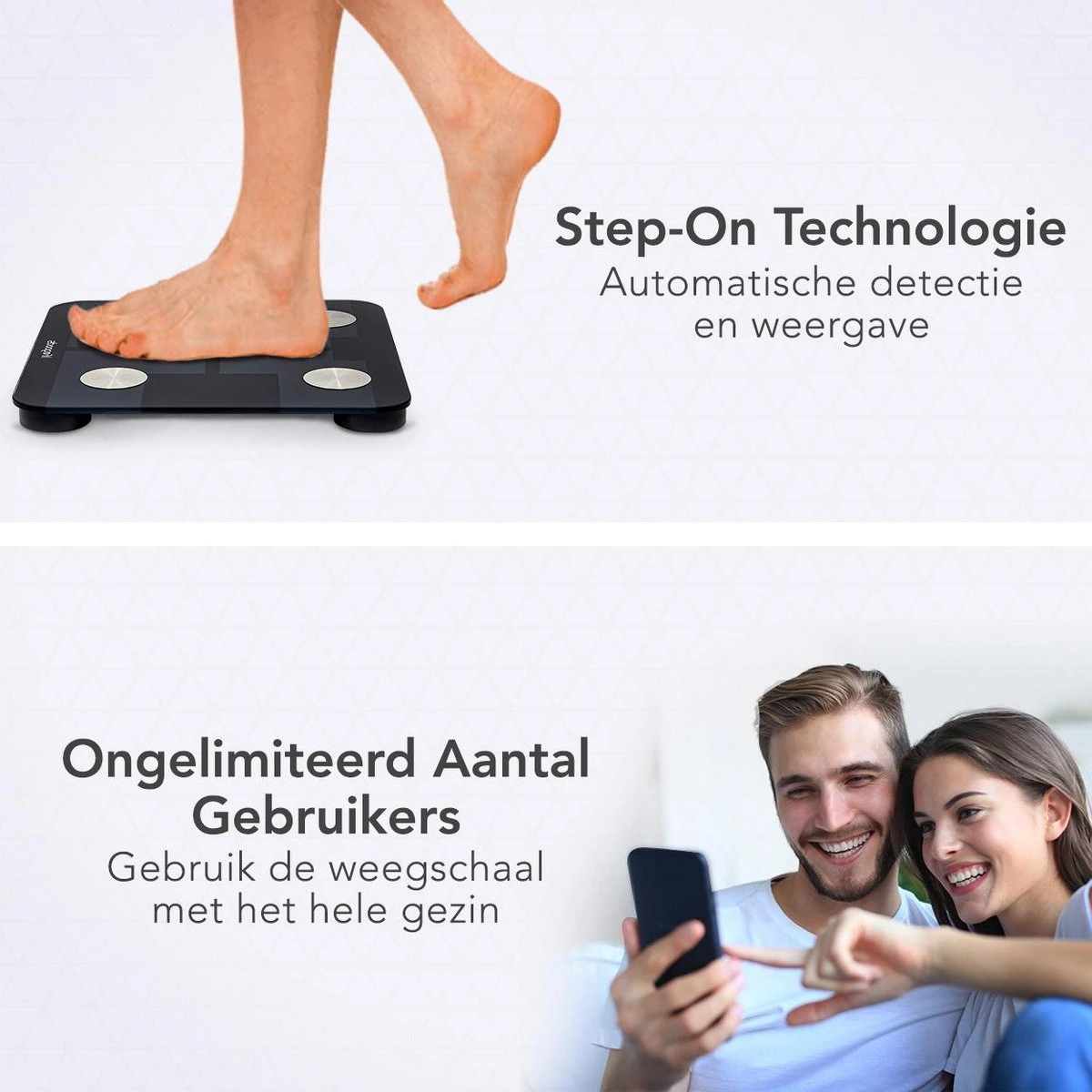 Op de weegschaal zitten vier metalen meetplaten die je lichaamssamenstelling inschatten door middel van een ‘Bioelectrical Impendence Analyse’ (BIA). Deze technologie stuurt als het ware een signaaltje door je lichaam heen. Op basis van wat hiervan teruggekaatst wordt naar de metalen platen kunnen alle verschillende metingen geschat worden!