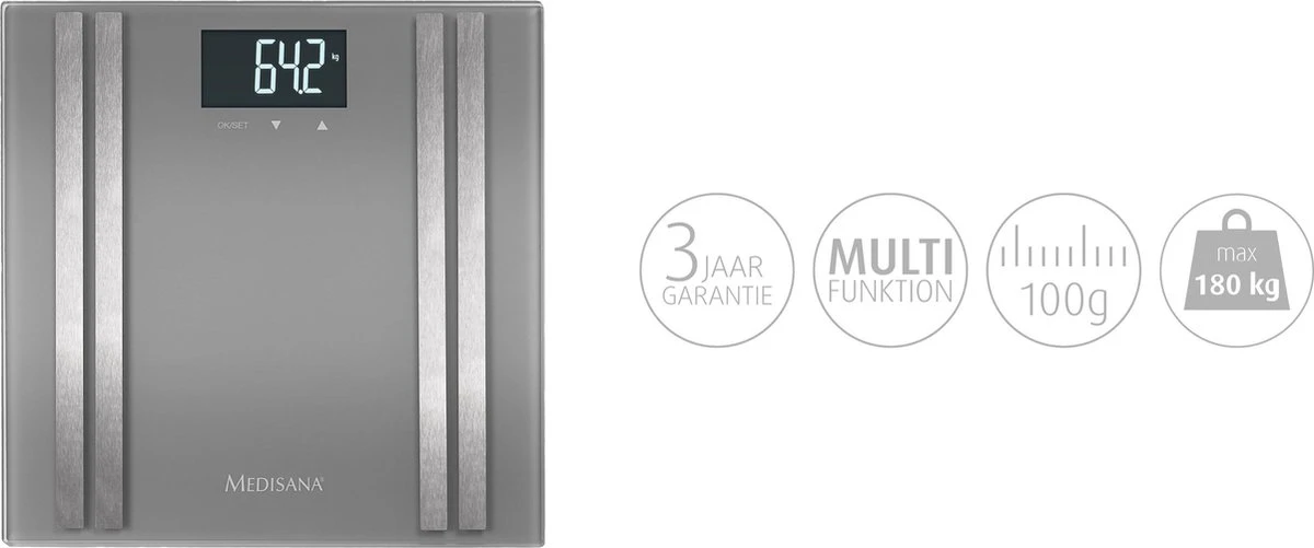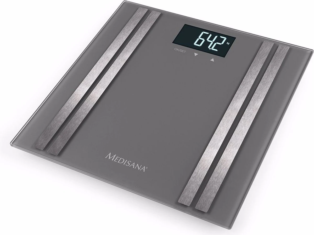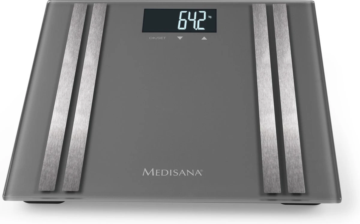 De Medisana BS 476 personenweegschaal behoort tot de nieuwste generatie lichaamsanalyse weegschalen van Medisana en bevat dan ook de nieuwste technische snufjes die Medisana door jaren aan ervaring heeft ontwikkeld. De geborstelde RVS-elektroden meten met uiterste precisie de weerstand door de beide voeten en stellen zo zeer nauwkeurig het vet- en vochtpercentage vast en berekenen de spier- en botmassa.