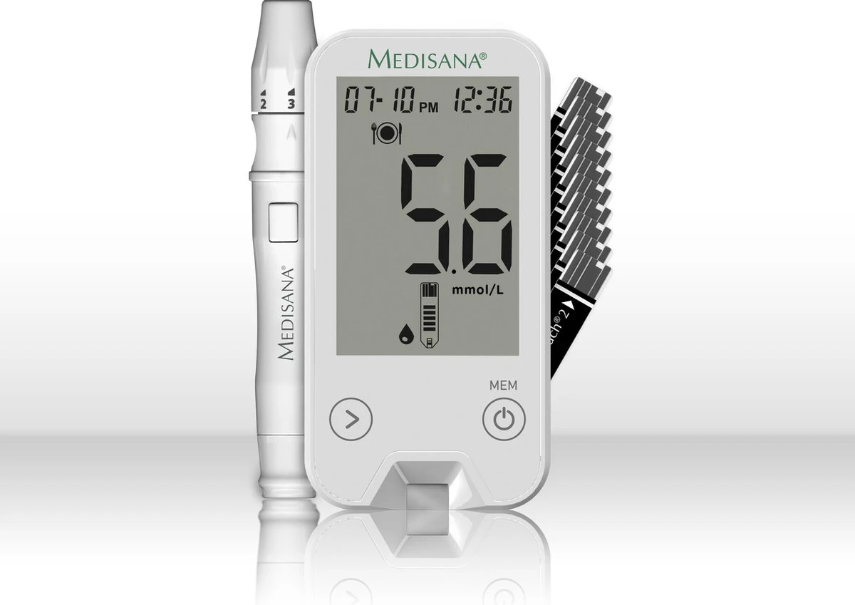 Het bloedglucose zelftest systeem MediTouch 2 van Medisana bestaat uit vijf componenten: de bloedglucosemeter, de prikhulp, 10 lancetten, 10 teststrips en de controlevloeistof.