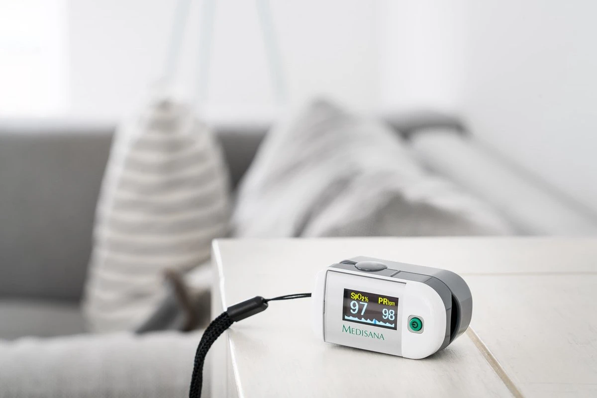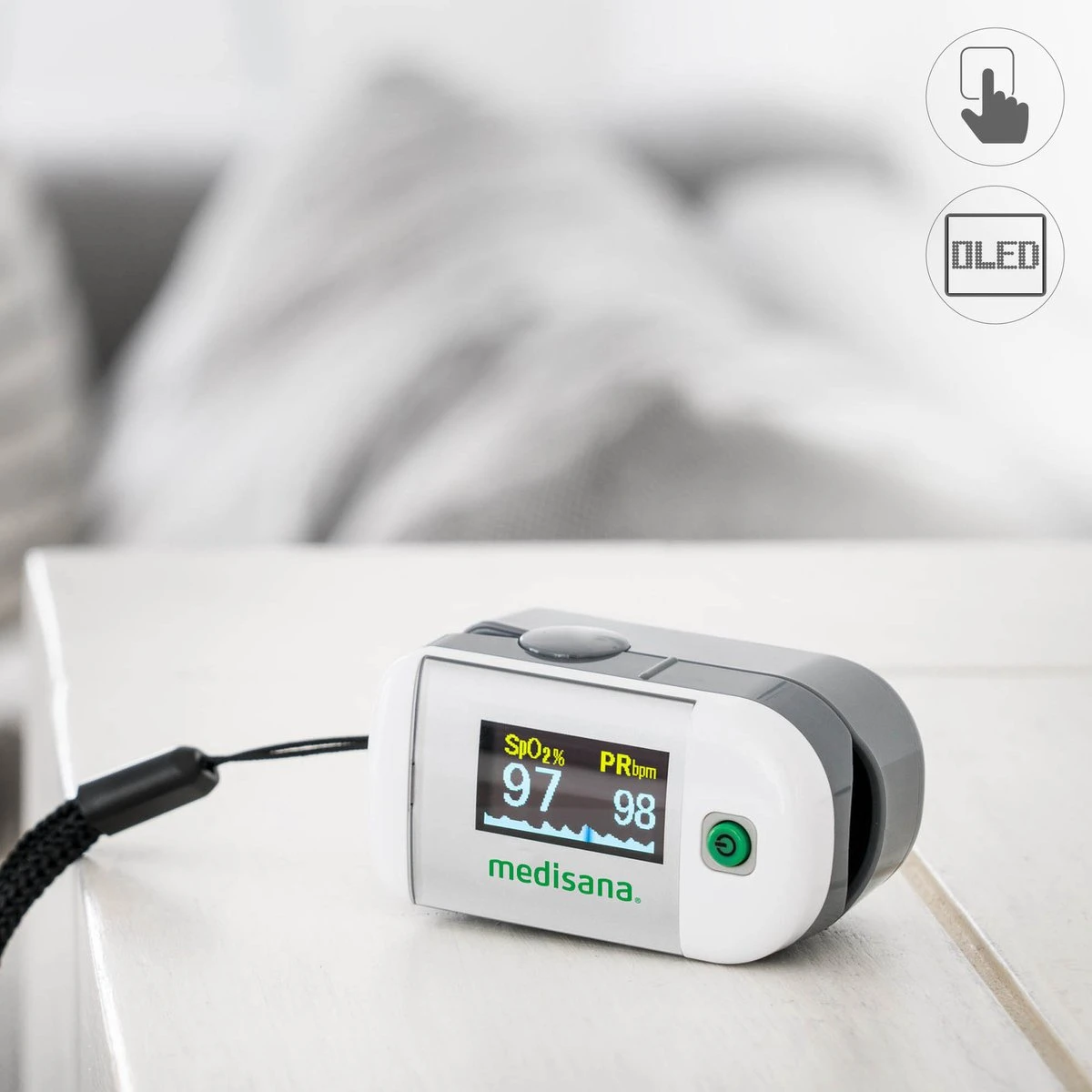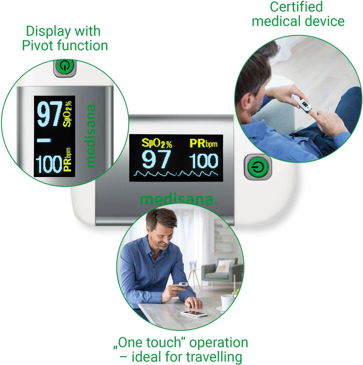 De saturatiemeter meet de zuurstofverzadiging van het bloed (SpO2%) en hartslagfrequentie. Zuurstofverzadiging en hartslagfrequentie kunnen in staaf- of golfdiagram worden weergegeven. Daarnaast draait de OLED-display 360° mee voor optimale leesbaarheid van de meetgegevens.