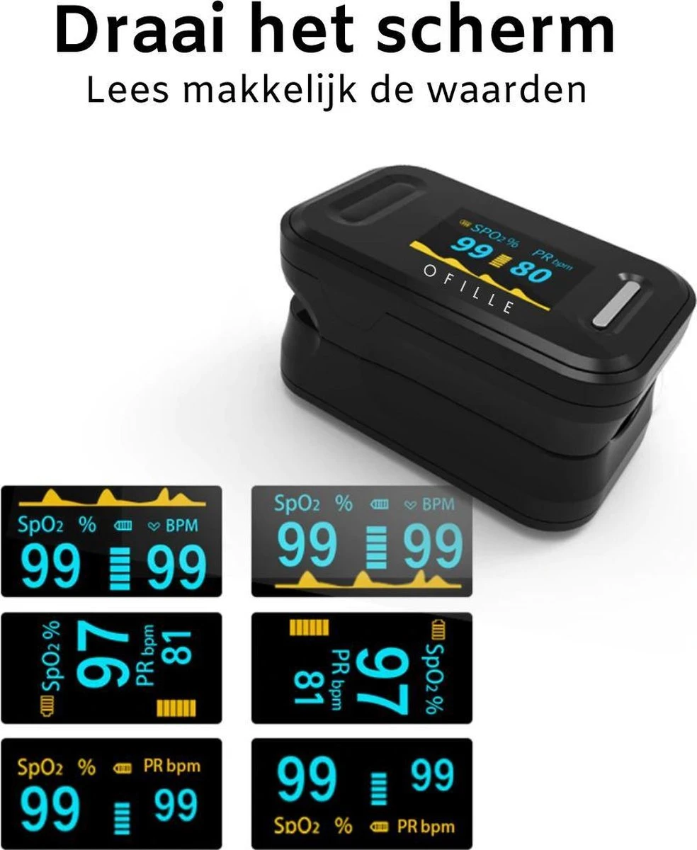 Met deze vinger zuurstofmeter kan op elk gewenst moment je zuurstofgehalte en hartslag gemeten worden. De oximeter kan veilig thuis gebruik worden voor je hele familie. Zorg goed voor elkaar en grijp op tijd in wanneer de waardes niet goed zijn.