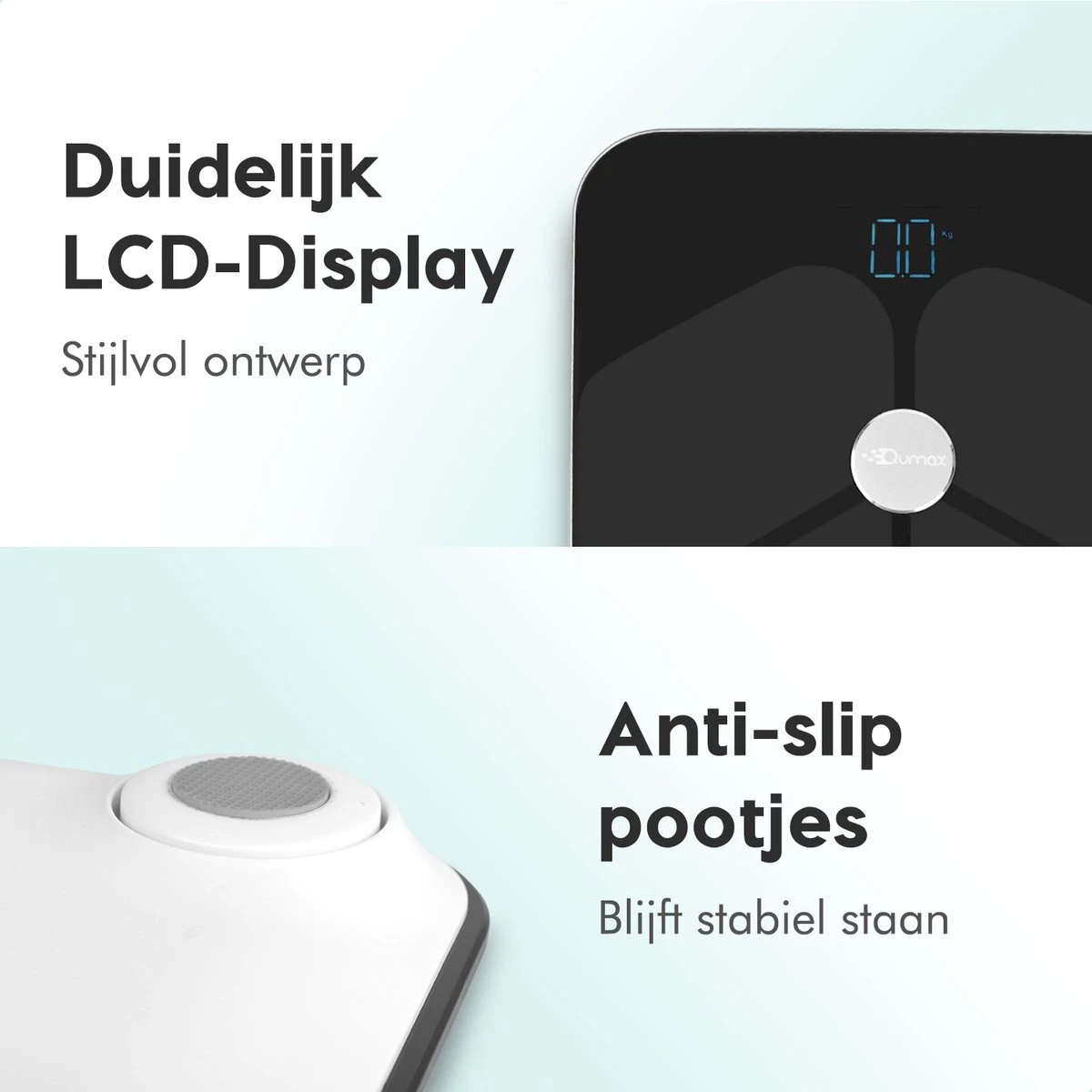 Meten is weten gaat zeker op voor de slimme weegschaal met lichaamsanalyse van Qumax. Met de personenweegschaal meet je niet alleen het lichaamsgewicht, maar kun je ook een volledige lichaamsanalyse maken. De slimme weegschaal kan bovendien via bluetooth worden verbonden met een app, waar je de resultaten van alle metingen overzichtelijk kan bijhouden en bekijken. Met de slimme weegschaal van Qumax wordt het een makkie om persoonlijke doelen te behalen!
