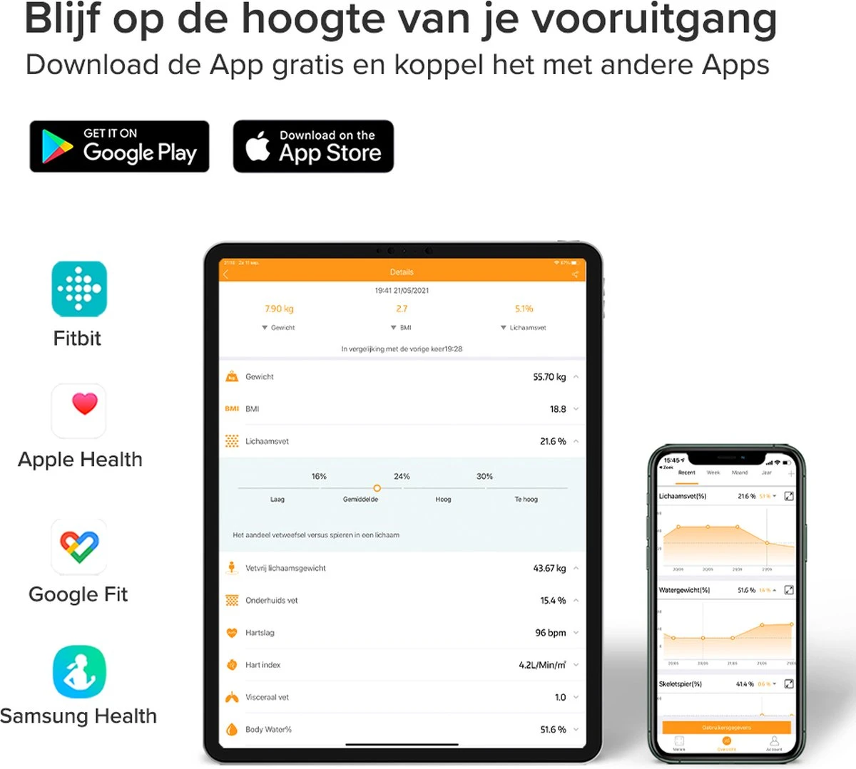 Houd je voortgang bij met de Robi S6 Weegschaal die verbinding maakt met diverse apps om je te helpen doelen te stellen, historische gegevens op te slaan en je dagelijkse, wekelijkse en maandelijkse voortgang bij te houden. Download de App in Apple Appstore of Google Play Store. (werkt met Bluetooth 4,0 en hoger.)