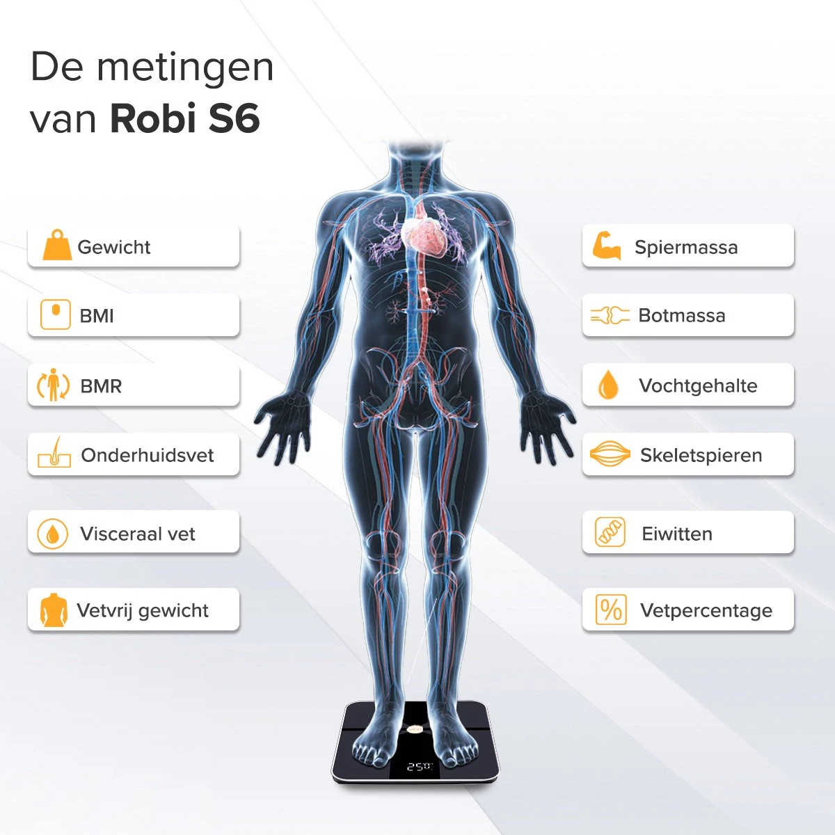 De Robi S6 is gemaakt om een uitgebreid maar vooral betrouwbaar inzicht te geven voor zowel professionals als beginners. De metingen gaan verder dan alleen gewicht door je meer bruikbare inzichten te geven dan alleen het getal dat op de weegschaal zichtbaar is. De metingen omvatten o.a. gewicht (kg, lb, st), vetpercentage, waterpercentage, gewichttrends, BMI, BMR, spier- en botmassa, etc.