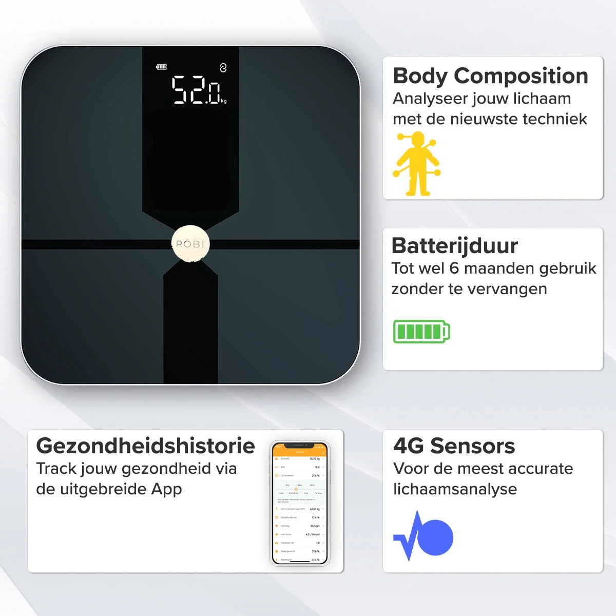 De Robi S6 Weegschaal is een slimme weegschaal met geavanceerde functies. De weegschaal maakt gebruik van de modernste technologie om de samenstelling van het lichaam nauwkeurig te bepalen, zoals het gewicht, vetpercentage, vochtgehalte, spier- en botmassa.