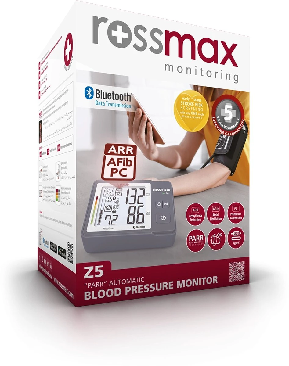 De Rossmax Z5 is een door de hartstichting aanbevolen klinisch gevalideerde bovenarm bloeddrukmeter. Deze nieuwe geavanceerde bloeddrukmeter van de Zwitserse fabrikant Rossmax is voorzien van hoogwaardige technologie, zoals o.a. ARR/AFib detectie, ARR/PC detectie en een smartphone verbinding. Met de ARR/AFib detectie kan de bloeddrukmeter signalen van boezemfibrilleren detecteren. De ARR/PC of Premature Contractie Detectie is uniek, geen enkel ander merk heeft deze technologie. Met deze detectie gaat de bloeddrukmeter na of er tijdens het meten een ‘extra’ hartslag is geweest. Teveel ‘extra’ hartslagen heeft namelijk een negatieve invloed op de werking van het hart. Met de smartphone verbinding kunt u via Bluetooth uw gemeten bloeddrukwaarden synchroniseren met de Healthstyle App van Rossmax op uw smartphone.