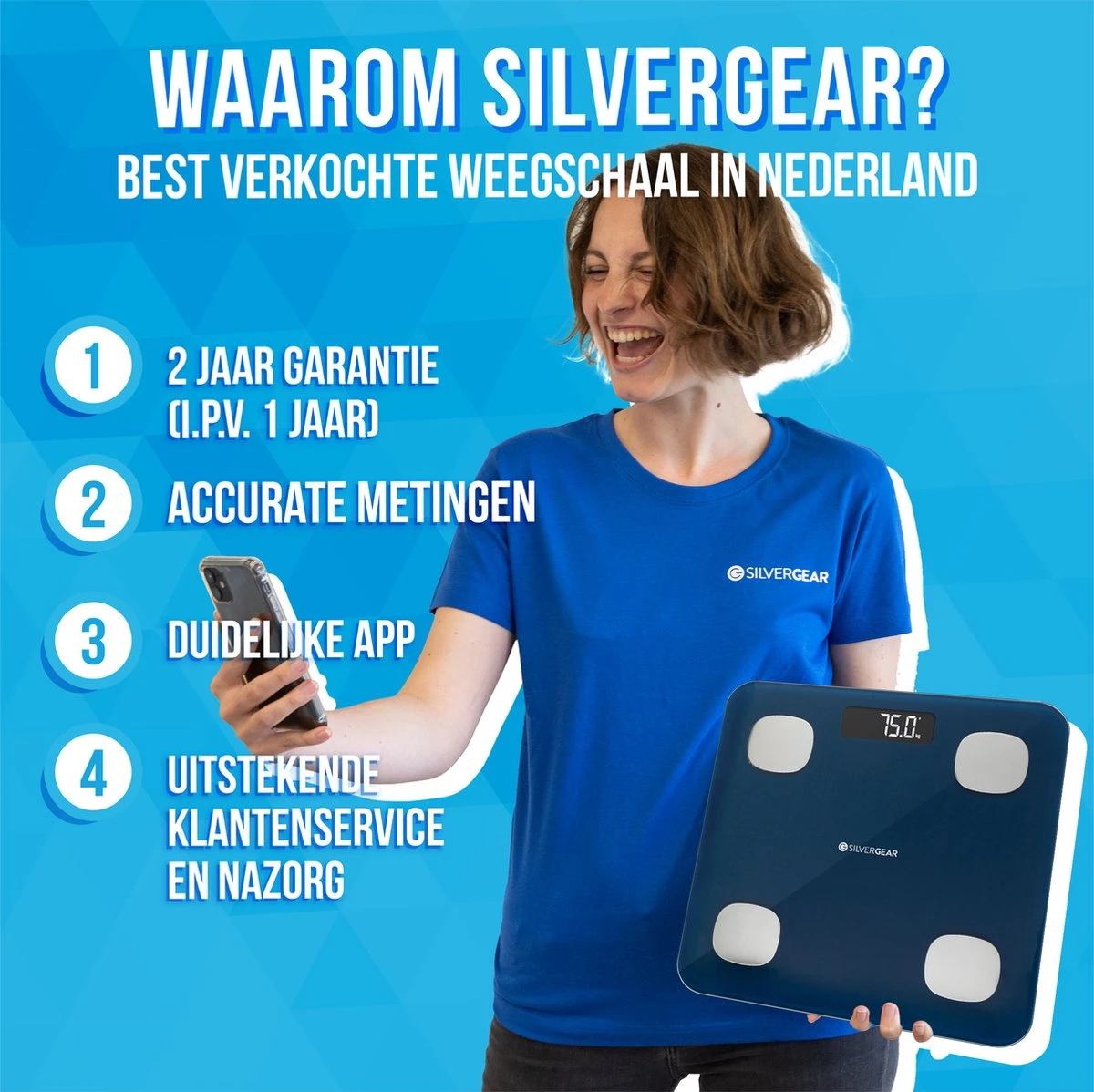 Silvergear weegschalen zijn van uitstekende kwaliteit en hier staan wij 100% achter. Daarom bieden wij excellente garantie. Mocht je toch niet helemaal tevreden zijn met dit artikel, neem dan contact met ons op en we zullen altijd voor je klaarstaan. Ook als je er even niet uitkomt staan wij iedere werkdag voor je klaar om je vragen te beantwoorden of je te helpen bij het instellen van je app en weegschaal.