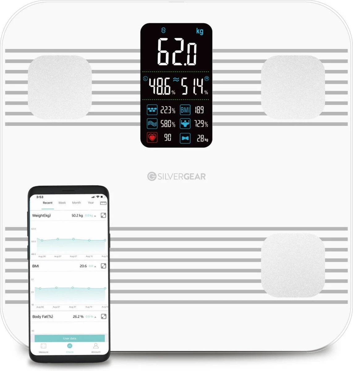 Geavanceerde smart scale met bijhorende app om je gezondheid mee te monitoren. Deze Premium Slimme Weegschaal heeft maar liefst 18 verschillende meetfuncties.