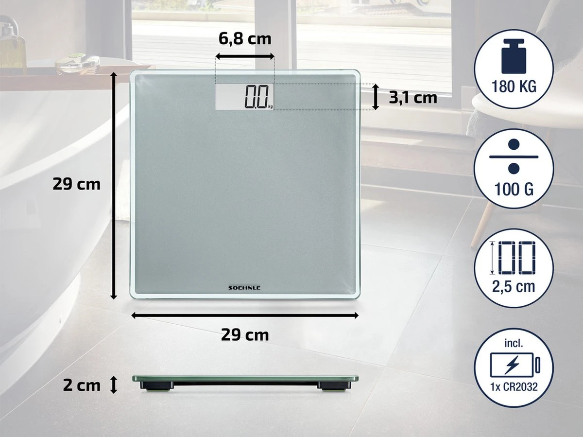 Met comfortabel weegplateau van hoogwaardig veiligheidsglas. Draagvermogen tot en met 180 kg. Het lichaamsgewicht kan gemakkelijk afgelezen worden op het goed leesbare lcd-display, op 100 gram nauwkeurig. Gemakkelijk in het gebruik, dankzij de geïntegreerde in- en uitschakelfunctie. De weegschaal gaat aan als je erop stapt en schakelt na het wegen automatisch uit. De weegschaal is energiezuinig en de meegeleverde batterijen gaan lang mee. Het batterij vak is vastgeschroefd – dat is wel zo veilig voor de kleintjes.