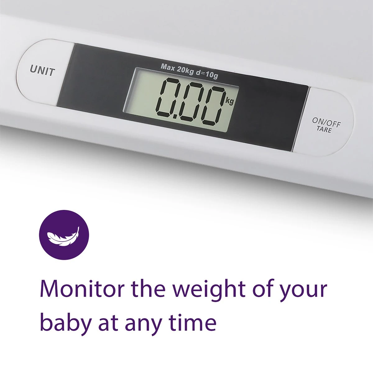 Dankzij de handige Tare-functie kan je het gewicht van een handdoek of deken van het weeggewicht afhalen. Je plaatst hiervoor eerst de handdoek op de weegschaal en drukt op de Tare-knop, de weegschaal zet zichzelf dan weer terug naar nul. Als je vervolgens je baby op de weegschaal legt, wordt alleen het gewicht van je baby weergegeven op het display.